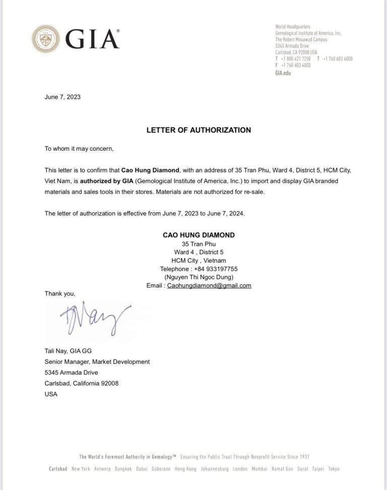 Từng viên kim cương tại đây có trọng lượng từ 3 ly 6 trở lên đều đi kèm với giấy kiểm định GIA. Và để bạn yên tâm hơn nữa thì có thể xem qua giấy xác nhận sau: